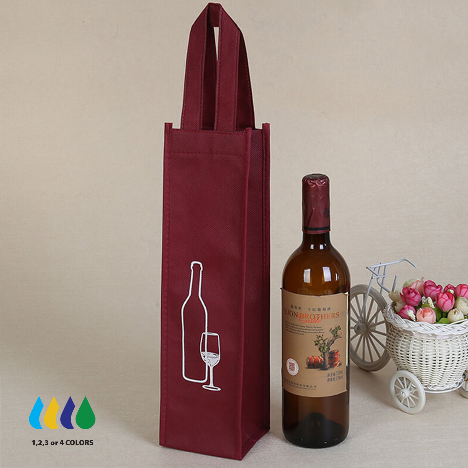 Lightweight, strong, reusable, and recyclable 65 gsm polypropylene bottle bags with die-cut handles, customizable with up to 4-color flexo printing.
