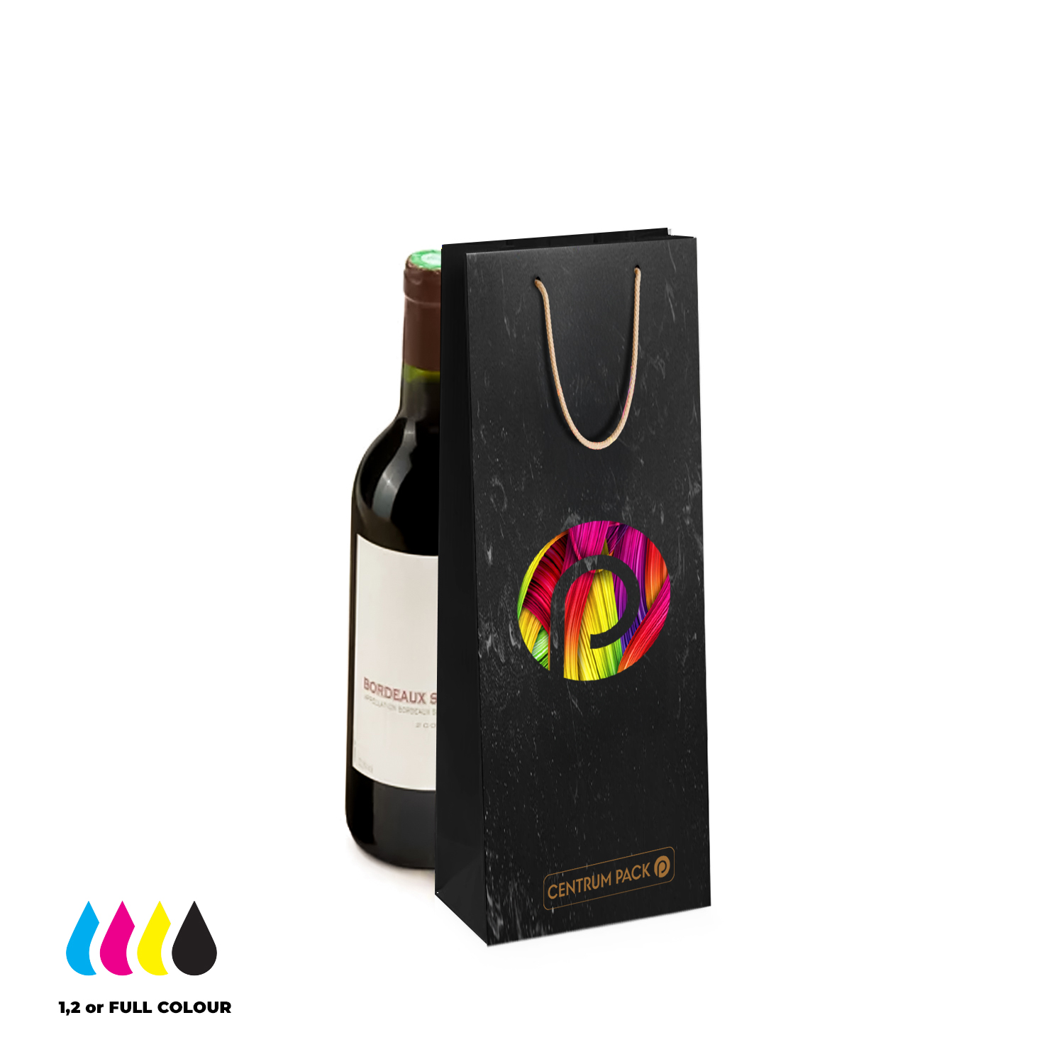 Luxury paper bags for bottles, ideal for wine, champagne, and beverages. Fully customizable with premium printing, ribbons, finishes, eco-friendly or laminated.